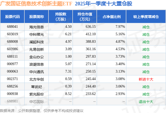 从基金规模来看,广发国证信息技术创新主题ETF基金2025年一季度公布的基金规模为0.8亿元,较上一期规模9068.19万元变化了-1088.52万元,环比变化了-12.0%。该基金最新一期资产配置为:股票占净值比99.08%,无债券类资产,现金占净值比0.97%。从基金持仓来看,该基金当季前十大股票仓位达41.86%策略聚宝,第一大重仓股为海光信息(688041),持仓占比为7.97%。